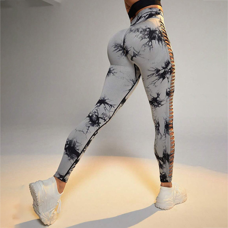 New Sports Tie-Dye Side Hollow Yoga Trousers Fashion High Waist Hip-lifting Sports Pants Seamless Stretch Leggings